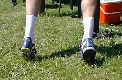 Rex demonstrates his paws, which he considers to be the secret of his success. Note that the left paw, which stands forward of the base on the whack (in grass, in this case), is a baseball spike, while the right paw, which stands on the sidewalk on the whack, is a turf shoe. Different circumstances will naturally require close attention to the type of paw chosen.