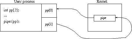 A pipe is a one-way communication channel defined by two file descriptiors, one open for writing and one for reading, such that what is written by the former can be read by the latter. A pipe is created by passing and array of two integers to the pipe() system call. Note that the data flowing in a pipe are managed directly by the kernel, so you can think of them flowing "through'' the kernel.