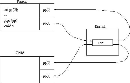Pipes make it nice for the sharing of file descriptors between parent and children. If you first open a pipe, and then spawn a child, parent and child will share the pipe's file descriptors as well, so you get the scenario depicted as follows: